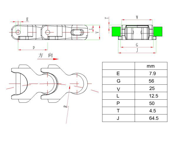 | 鏈條型號(hào) | 寬度W(mm) | 重量(Kg/m) | 反向彎曲半徑(mm) | 轉(zhuǎn)彎半徑(mm) |